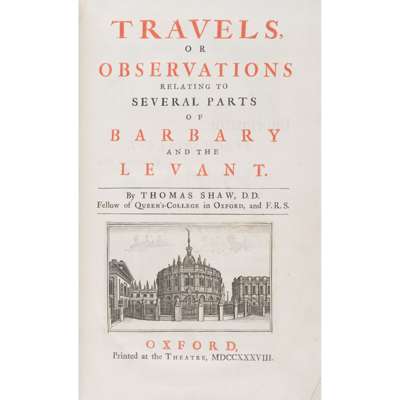 Oxford: printed at the Theatre, 1738. First edition, folio (35.1 x 22cm), contemporary panelled calf, [8] xv [1] 442 60 [8], half-title, title-page printed in red and black with engraved vignette, engraved headpieces and initials, frequent Arabic types, 11 engraved maps and plans (of which 6 folding), 20 engraved plates on 17 leaves (3 leaves having a plate printed on each side), engraved folding itinerary, one full page of engraved music, spine-label chipped, marginal annotation to p. 413 (relating to cubits: likely to be by James Stirling) [ESTC T114690]