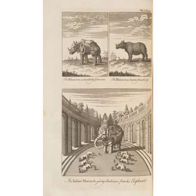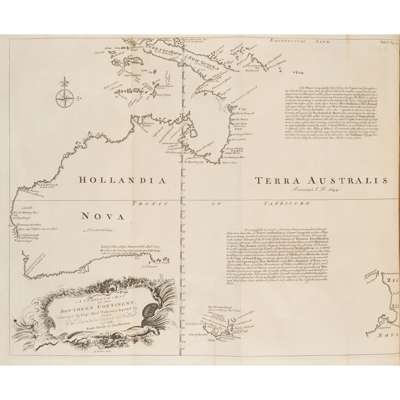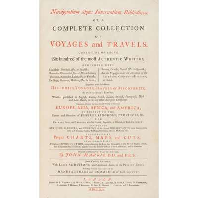 Or a Complete Collection of Voyages and Travels. London: T. Woodward, 1744. Second edition, 2 volumes, folio, titles in red and black, engraved portrait frontispiece in volume 2 (licence leaf in volume 1), 22 engraved maps and 38 plates, contemporary calf, slightly rubbed, some very minor damp-staining to endpapers and initial leaves of volume 1 [Hill 775; Tooley (Australia) 241; Sabin 30483; Goldsmiths 8040]