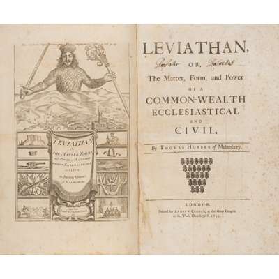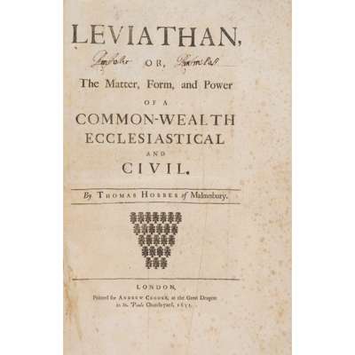 or, the Matter, Form, and Power of a Common-Wealth Ecclesiastical and Civil. London: Andrew Crooke, 1651 [i.e. John Darby or John Richardson, c.1695-1702]. Third edition, folio (32.8 x 20cm), contemporary panelled calf, spine richly gilt in compartments, engraved frontispiece, title-page with typographic ‘ornaments’ device, folding letterpress table, joints rubbed, front free endpaper pasted down, rear free endpaper partly detached, title-page spotted and creased and with partly legible ownership inscription, occasional light spotting elsewhere, a few leaves browned, ‘The Contents of the Chapters’ and ‘The Introduction’ (A3-4) transposed, [ESTC R13935; Macdonald & Hargreaves 44]