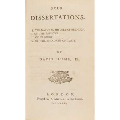 I. The Natural History of Religion. II. Of the passions. III. Of Tragedy. IV. Of the Standard of Taste. London: for A. Millar, 1757. First edition, 12mo (16.2 x 9.5cm), contemporary calf, [4] vii [3] 240 pp., half-title with advertisements verso, retaining dedication to John Home (pp. i-vii), K5-8 cancelled, C12 and D1 cancels, stubs of cancelled leaves visible, p. 9 first word ‘ative’, p. 131 first word ‘lancing’, spine rubbed, label perished [ESTC T4011]