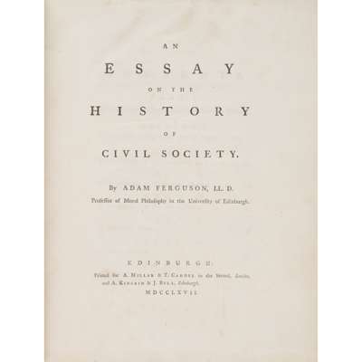 First edition, a wide-margined copy of Ferguson's masterpiece, a major Scottish Enlightenment text which proved hugely influential among contemporary British and continental European readers alike. Ferguson's analysis of the problems facing advanced commercial societies 'touched a chord in its British readers because it offered a detailed, colourful, non-deterministic historical account of the way nations advance morally and materially towards the state of commerce, refinement, and liberty associated with eighteenth-century Britain ... The Essay made its author famous throughout Europe … Of special significance was the Essay's impact on the early attempts at creating the disciplines of social sciences by Ferguson's contemporaries' (ODNB).