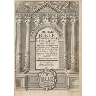 Cambridge: John Field, 1668. 4to (22.2 x 16cm), unpaginated, signed pi2 A-2Q4 (2Q4 blank), A-M4, contemporary black morocco, spine and covers panelled in gilt, marbled pastedowns, all edges gilt, engraved architectonic title-page by John Chantry, New Testament title-page dated 1666, The Psalms of David in Meeter (Edinburgh: by Andrew Anderson, for James Miller, 1671) bound in at rear and with architectonic woodcut border to title-page, inscription ‘Mrs Grahame, July 7th 1702, to be bound in finest blew turkie guild over on the back onlie' on blank verso of final leaf of New Testament ('Mrs' apparently written over the name ‘James'), ownership inscription of Anne Stirling dated 1765 to verso of title-page, binding rubbed [Herbert 697]