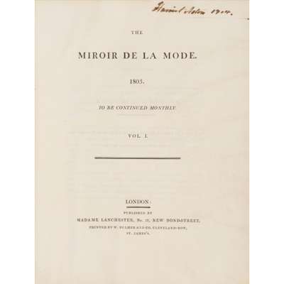 Mrs Lanchester was a modiste and dress designer who had shop premises on London's New Bond Street. According to Tooley, the first volume was all that was published, although sale records cite copies of a second volume from 1804 containing either three or five plates, suggesting that publication may have ceased before the completion of the volume. According to the British Museum biography ‘one plate is known' from an attempt to revive the work in 1807, and Mrs Lanchester was declared bankrupt in 1810.