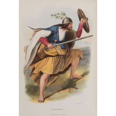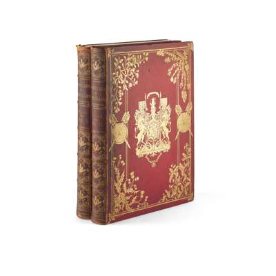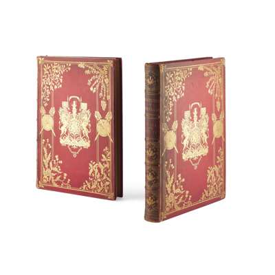 … With Accompanying Description and Historical Memoranda of Character, Mode of Life, etc. etc. London: Willis and Sotheran, 1857. Second edition, 2 volumes, folio (36.4 x 25.4cm), original red quarter morocco, spines gilt in compartments, covers with elaborate overall gilt decoration incorporating large centrepieces of the royal arms of Scotland, all edges gilt, 72 hand-coloured lithographic plates of Highland dress, 2 chromolithographic heraldic plates, bookplates of Archibald Stirling, joints and tips rubbed, gutta percha perishing with several plates detached or detaching, a few plates soiled and with evidence of removal, mounting (with adhesive residue verso) and reinsertion, occasional light marginal spotting elsewhere [Tooley 323]