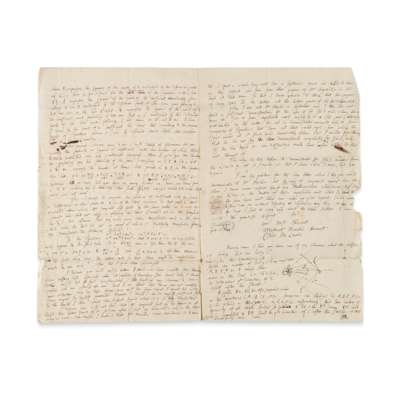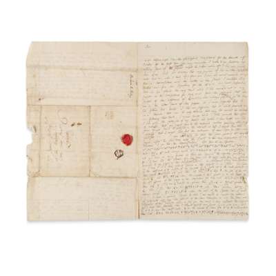 addressed to James Stirling ‘at the Academy in Little Tower Street, London’, dated Edinburgh, 11th February 1728 [Old Style, i.e. 1729], expressing agitation regarding the replication of his work on the ‘impossible roots' in a paper by Campbell in the Philosophical Transactions for October, asserting his own claim to priority, and providing demonstrations (including one diagram), with frequent references to Newton ('Sir Isac') and John Machin: ‘I cannot therefor but be a little concerned that after I had given the principles of my method and carried it some length and had it marked that my paper was to be continued, another pursuing the very same thought should be published in the intervall … You would easily see that the latter part of Mr Campbell’s paper after he has done with the limits is the very continuation of my theorems if you had the demonstrations … I believe you will easily allow that I could not have invented these theorems since Tuesday last especially when at present teaching six hours daily I have little relish for these investigations’, foolscap bifolium written on 3 sides, 36 x 22cm, a few chips and tears to fore margins, retaining red wax seal