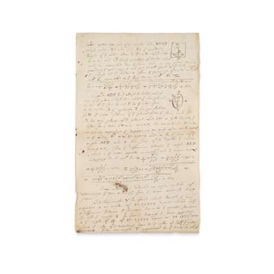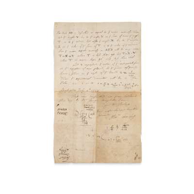 dated Kensington, 4th July 1728, containing demonstrations of four mathematical proofs ‘transmitted me from Scotland this day by Mr George Campbell’ (i.e. 'Let water run out of the circular hole NBRD whose radius BC=r'; ‘Le ADP be the elliptick orbit which any of the planets describes about the Sun placed in one of the foci S’; ‘Let the angle Y be found which beareth the same proportion to an angle of 57.29578 degrees’; ‘Let z represent the ratio of the centripetal force at the aequator of any planet to the power of gravity there’), with diagrams illustrating the first two proofs, addressed and signed at foot ’Dear Mr Stirling, Your most obedient humble servant, Alexr Cuming', 2 pages, 30.5 x 19cm