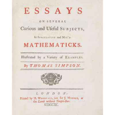 'The first application of the Newton-Raphson process to the solution of transcendental equations’ (Cajori, History of Mathematics, 1919, p. 227). The work contains thirteen papers, of which the second ‘treats of the motion of bodies affected by projectile and centripetal forces, wherein the invention of orbits and the motion of apsides, with many others of the most considerable matters in the first book of Sir Isaac Newton’s Principia, are fully and clearly investigated' (Simpson's preface, p. vi).