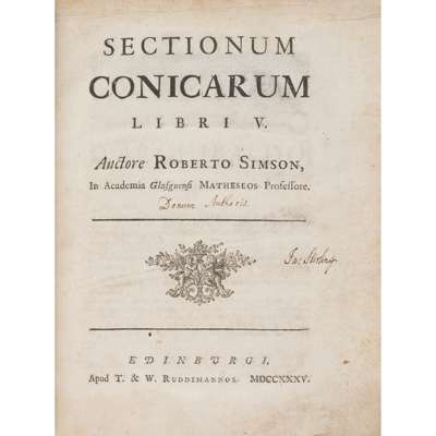 First edition, presentation copy from the author to James Stirling, with Stirling's ownership inscription ‘Ja: Stirling’ and his annotation ‘Donum Authoris’ to the title-page. Robert Simson held the chair in mathematics at the University of Glasgow for 50 years, from 1711 to 1761, making a lasting impact on mathematical education in Scotland. He was an important figure in the restoration and translation of classical mathematical texts, and his standing as a geometer is reflected in the enduring legacy of the ‘Simson Line’. Together with James Stirling and Colin Maclaurin he was one of three pre-eminent Scottish mathematicians in the first half of the 18th century. Stirling and Simson engaged with Newton's legacy in different ways: Stirling (and Maclaurin) were ‘part of the research programme in Britain spawned by Newton’s formulation of the fluxional calculus, while the work of Robert Simson and Matthew Stewart was inspired by Newton's preference for geometrical as opposed to algebraic analysis' (Broadie, ed., The Cambridge Companion to the Scottish Enlightenment, 2003, p. 105).