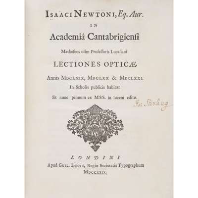 Newton's inaugural lectures as the second Lucasian professor of mathematics at Cambridge were delivered between 1670 and 1672, and included details of his famous prism experiment. A partial English translation was published in 1728. ‘In 1669 Newton chose optics for his first lectures, and at that time he polished the theory of colours into its final form. The ’Lectiones opticae' ('Optical lectures'), deposited in the Cambridge University Library as the text of his first four sets of lectures, contains all the content of book one of the ultimate Opticks. About then he also returned to the experiment with Newton's rings, as they are still called, which would fill book two' (ODNB).