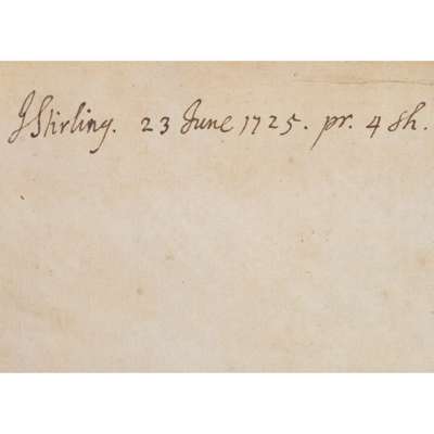 First edition, second issue, with James Stirling's ownership inscription and purchase note ‘J Stirling 23 June 1725 pr. 4 sh’ to an initial blank. A letter from William Stirling of Tarduff (tipped to the rear endpaper) explains that this is one of two books which he retrieved from the offices at Leadhills and had rebound, the other being a copy of the doctoral dissertation of German physician Wilhelm Nebel's, presented to Stirling by Nicolaus Bernoulli (see lot 28). A pencilled note to the initial blank adds: ‘This book belonged to James Stirling…known as ‘The Venetian’, it was found at Lead Hills, Lanarkshire, and given to James Stirling of Glentyan by his nephew Wm Stirling, Christmas 1881’.
