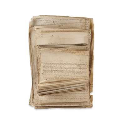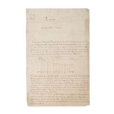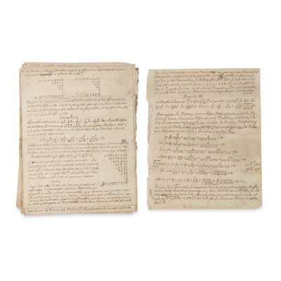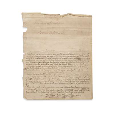 author's holograph manuscript, c.1730, written in ink on loose leaves, ‘Pars Prima’ comprising 64 numbered pages measuring 190 x 230mm, followed by ‘Pars Secunda’ being numbered pages 64 [i.e.65]-111 [i.e. 112] on larger leaves measuring 20 x 31cm to 22.5 x 36cm, the text including the published introduction but without the preface or errata, verso of the final leaf (with Propositio XXXIII recto) with Stirling's recommended title ('Methodus Differentialis …') and notes to the printers (‘If there be any room left in the last page, it may be filled up with Errata, but in case there be no room left, the Errata may be put in the end of the preface’ and ‘I kept the boy above a quarter of an hour here; send me the rest of the Leaves that are printed off & a proof of this as soon as you can, because I must look it over and see if there are any Errata’). Occasional corrections, variable light soiling, a few small chips and losses to edges