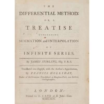 or, a Treatise concerning Summation and Interpolation of Infinite Series. Translated into English, with the Author's Approbation, by Francis Holliday. London: for E. Cave, 1749. 4to in half-sheets (23.1 x 17.5cm), contemporary sprinkled calf with gilt lozenges and beaded rules to spine-compartments, viii 141 pp., advertisement leaf at rear, with 2 laid-in autograph letters signed from Francis Holliday to James Stirling (each a foolscap bifolium, 3 and 4 pp., first letter addressed to Stirling at Leadhills and dated 15 April 1747, with a few tears, the second undated but evidently addressing Stirling's response to the first letter) [ESTC N6849; Wallis 307.885]