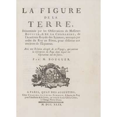 First edition ‘of ’the most important work to issue from the Peruvian expedition of 1735-1744, undertaken … with the goal of measuring an arc of the meridian near the equator, which resulted in the determination of the shape of the earth as an oblate spheroid' (Norman). In addition to the main geodetic programme, Bouguet used the expedition to carry out important work on atmospheric refraction, the dilation of solids at different temperatures, and the measurement of heights using a barometer.