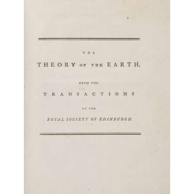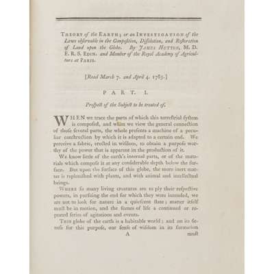 First edition, the extremely rare offprint issue, of one of the most important scientific papers ever published, apparently preceding its appearance in the first volume of the Transactions of the Royal Society in Edinburgh in 1788. The paper was read to the Royal Society of Edinburgh in March and April 1785, and ‘offprints … were in circulation in 1787, and possibly in 1786’ (DSB). It proposed for the first time that geological phenomena were to be explained by immutable laws rather than supernatural intervention, an interpretation which came to be known as 'uniformitarianism'. The paper was expanded by Hutton for publication in book form, of which the first two volumes of a projected three were published in 1795; the work remained incomplete on Hutton's death in 1797, with the third and final volume, compiled from his notes, not appearing until 1899.