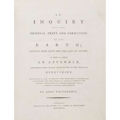 [Bound after:] Whitehurst, John. An Inquiry into the Original State and Formation of the Earth. London: for the author, 1778. [8] 199, half-title, 4 engraved plates (2 folding), with one additional folding plate apparently not called for ('Section of the … Lead Mines in Wear-Dale', frayed).