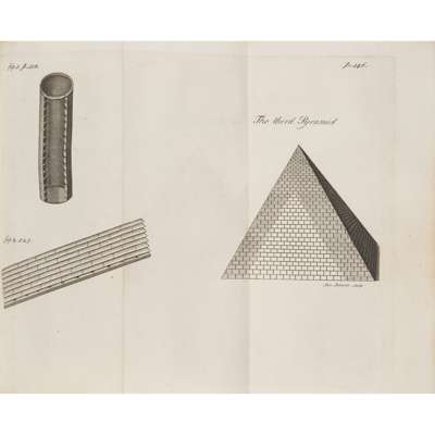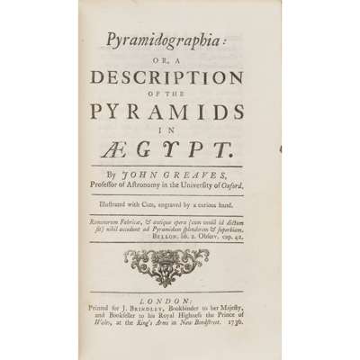 First collected edition, including the first edition in any language of Isaac Newton's ‘A Dissertation upon the Sacred Cubit of the Jews … Translated from the Latin of Isaac Newton, not yet published’ (volume 2, pp. 405-433), which itself refers at length to Greaves's own work on the subject, Pyramidographia (1646). Stirling's notes and markings in this copy are related chiefly to passages on ancient weights and measures, on which subject he wrote an unpublished manuscript treatise (see lot 73).