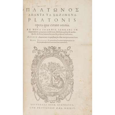 [graece]. Opera quae extant omnia. Ex nova Joannis Serrani interpretatione … Henr. Stephani de quorundam locorum interpretatione judicium, et multorum contextus Graeci emendatio. [Geneva:] excudebat Henr. Stephanus [Henri Estienne the younger], 1578. First edition of the translation by Jean de Serres and first complete edition, 3 volumes, folio (36.8 x 23.8cm), near-contemporary mottled calf, woodcut device on title-page, woodcut headpieces, initials and culs-de-lampe, some marginalia in Greek in an early hand, inscription in Greek dated 1653 repeated to each front free endpaper (with addition in Latin dated 1665 in volume 1), bindings worn, all volumes with some damp-staining to upper margins, corresponding old repairs obscuring a few page numbers and running heads, a little additional damp-staining in places, some very minor marginal worming [Adams P1439; Renouard cols. 145-6; Schreiber 201; USTC 450772]