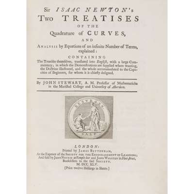 and Analysis by Equations of an Infinite Number of Terms, explained: containing the Treatises themselves, translated into English, with a Large Commentary … by John Stewart. London: by James Bettenham, at the expence [sic] of the Society for the Encouragement of Learning; and sold by John Nourse and John Whiston, 1745. 4to (25 x 18.5cm), contemporary sprinkled calf, xxxii 475 [4] pp., engraved vignette to title-page, diagrams throughout text, engraved tailpiece after William Kent, pencilled mathematical diagrams and equations to front free endpaper, superficial cracking to foot of front joint and head of rear joint [Babson 210; Wallis 303]