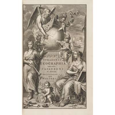 [graece]. Rerum geographicarum libri XVII. Amsterdam: J. Wolters, 1707. 2 volumes, folio (31.6 x 19.6cm), half-title to each volume, volume 1 with title-page in red and black with engraved vignette, engraved additional title-page, Greek and Latin text in parallel columns, contemporary sprinkled calf, spines gilt in compartments, rubbed, title-labels perished (retaining numbering-labels), joints cracked, strip of skinning to volume 1 front cover (2)