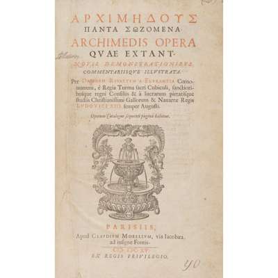 First edition of this influential bilingual version of the works of Archimedes, based on the Greek editio princeps of 1544 with assistance from what is now known as the ‘B’ manuscript (Codex Parisinus 2360). The propositions are in Greek, while the proofs are in Latin and ‘somewhat retouched’ (Heath, The Works of Archimedes, 1897, p. xxix).