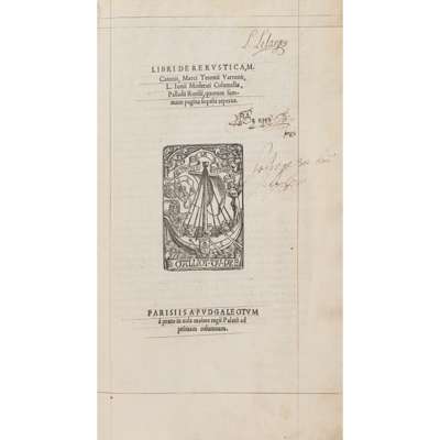 Paris: apud Galeotum [Galliot], 1533. Folio (33.1 x 21cm), contemporary French calf, gilt fleurons to spine-compartments, gilt strapwork lozenge to centre of each cover, text in roman letter, ruled by hand in red ink, printer's woodcut device to title-pages, a few woodcut diagrams in text, early annotations and ownership inscriptions including ‘L. Lelarge' to front endpapers and title-page, occasional early marginalia, binding worn, spine with later manuscript title to top compartment and loss to head and foot, a few small marginal worm-tracks, intermittent damp-staining, final blank H10 apparently original but pasted down, replacing endpaper [Adams S810]