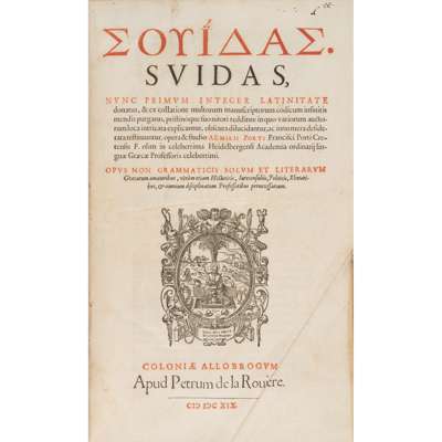 … opera et studio Aemili Porti. Geneva: Petrum de la Roviere, 1619. 2 volumes, folio (33.5 x 21cm), title-pages in red and black with printer's woodcut device, Greek and Latin text in parallel columns, later tan calf gilt, armorial bookplates reading 'De Tudert, covers rubbed, shallow loss to head and foot of each spine, splitting to joints-ends, volume 1 initial gatherings creased (2)