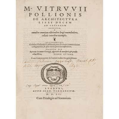… accesserunt Gulielmi Philandri Castilionii, civis Romani annotationes castigatiores, et plus teria parte locupletiores. Lyon: apud Joan. Tornaesium [Jean de Tournes], 1552. Folio (24.8 x 16.2cm), contemporary French sheep panelled in blind with gilt fleurons to spine compartments and within roundels to centre of each board, [8] 447 [29] pp., A4 ²A4 a-z4 ³A-³Z4 2a-2r4, retaining the errata (2r3) and the final leaf (2r4, blank but for publisher's woodcut device verso), folding plate, criblé woodcut initials, woodcut illustrations in text including roundel portrait to²A4 verso, roman and italic types, title-page inscribed ‘Emp. Ludg. anno 1552 12 s 6 d.' (apparently later), occasional manuscript marginalia in ink and old underlining in sanguine crayon (see provenance), marginal spill-burn to ³M1, wear and skinning to binding, slightly later manuscript spine-title [Adams V908; Cicognara 912]