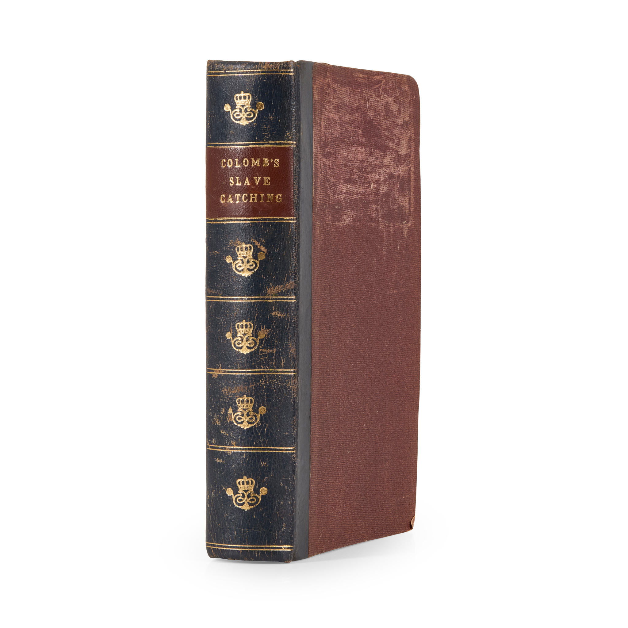 A Record of Naval Experiences. London: Longmans, Green, and Co., 1873. First edition, 8vo (21 x 12.5cm), [10] 503 pp., near-contemporary blue quarter roan with gilt spine, maroon cloth sides, all edges gilt, half-title, 8 wood-engraved plates including frontispiece, folding lithographic map (linen-backed), label removed from front board, contemporary circulating library bookplate to front pastedown, pp. 1/2 with lower fore corner cut away not affecting text, ff. K3-6 (pp. 133-140) held by bottom cord only
