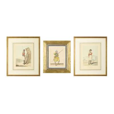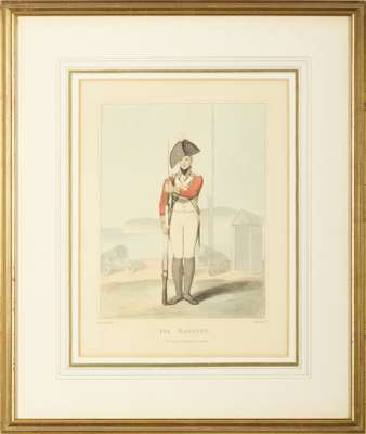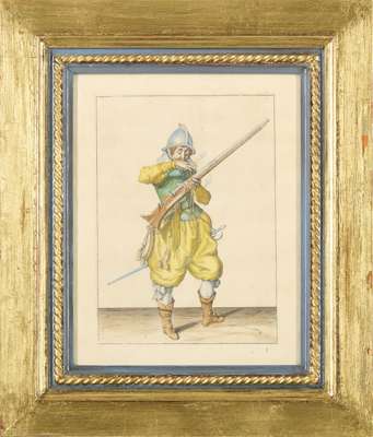 London: E. Scott, 131 Old Bond Street, 1797. 8 etchings with original hand-colour, mounted, framed and glazed, mount apertures 36.5 x 28cm, titles comprising ‘Fix Bayonet’, ‘Charge Bayonet’, ‘Port Arms’, ‘Order Arms', ‘Order Arms, First Motion’, ‘Order Arms, Second Motion’, ‘Shoulder Arms’, ‘Present Arms, Second Motion’. Together with 6 engraved plates from an early edition of Jacob de Gheyn, The Exercise of Armes, 1608 or later (hand-coloured, mounted, framed and glazed, 30 x 23cm) (14)