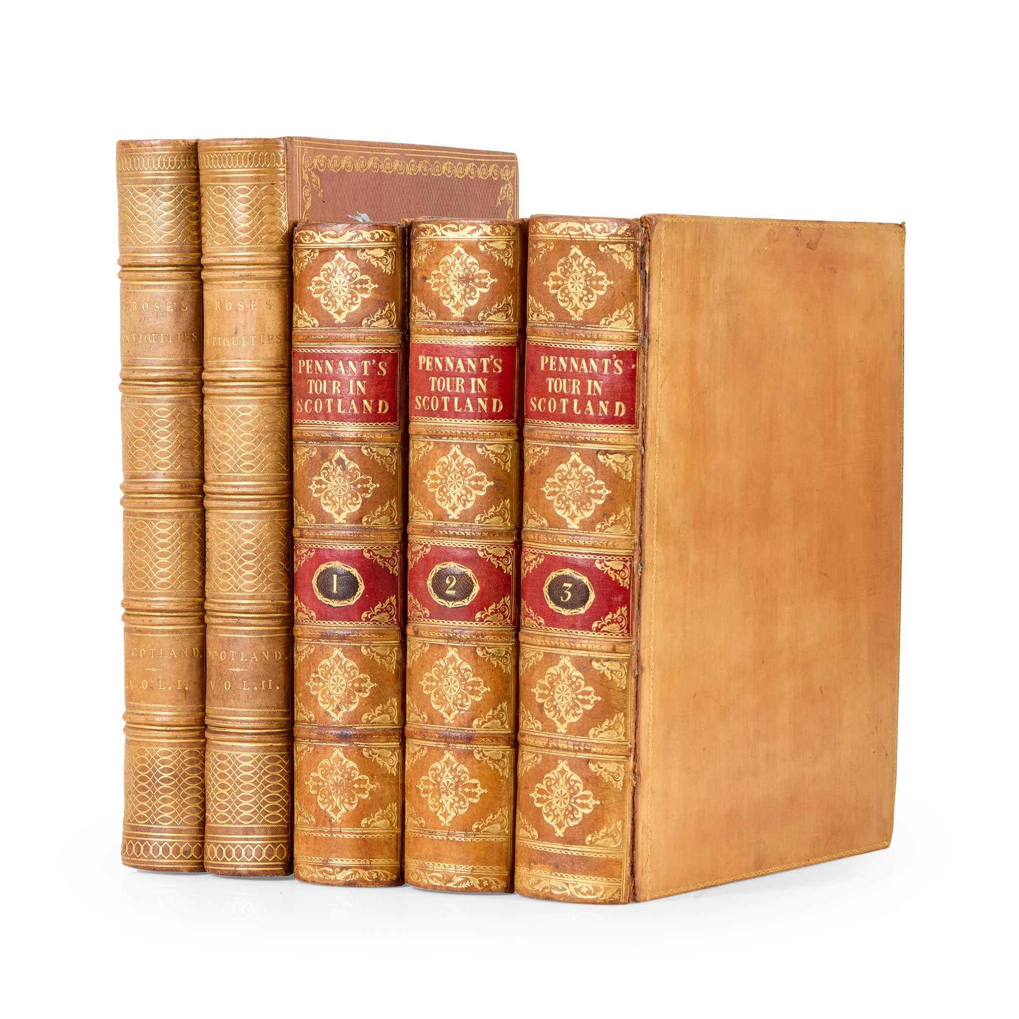 Grose, Francis. The Antiquities of Scotland. London: printed for S. Hooper, 1789. First edition, 2 volumes, folio, large-paper copy, engraved plates, lacking map in volume 1, contemporary diced russia with gilt tooling, plate of Littledean Tower misbound in vol. 1, spines of bindings sunned [ESTC T141301] (5)
