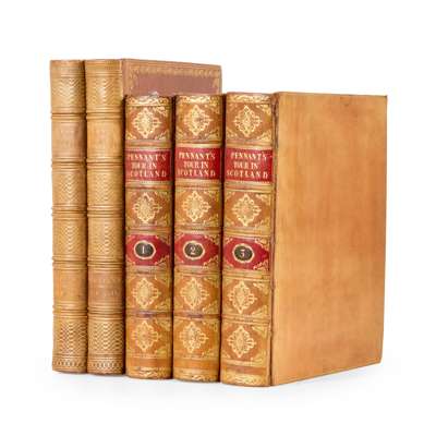 Pennant, Thomas. A Tour in Scotland; MDCCLXIX. London: Benj. White, 1790. Fifth edition, 4to, large-paper copy, 42 engraved plates (some cropped and mounted on paper), lacking folding map of Scotland and northern England, extra-illustrated with several plates and maps from 18th- and 19th-century publications, 19th-century tan calf, gilt spine, joints cracking, press clippings loosely inserted, armorial bookplate of Thomas Fitzgerald [ESTC T110282];