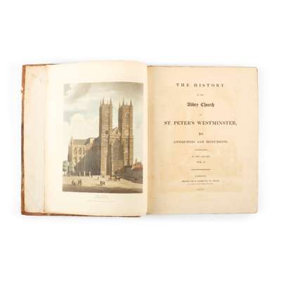 its Antiquities and Monuments. London: printed for R. Ackermann, 1812. First edition, first issue, 2 volumes, xviii, 330, [6] pp.; [4], [2]-204, 204*-205*, 205-275, [4] pp., engraved portrait and plan, 81 hand-coloured aquatints, 4to (36 x 27cm), marbled boards, rebacked and recornered retaining original labels on spines, with half-titles, edges untrimmed, some staining and offsetting throughout, occasional spotting, 1 bolt unopened in volume 1, introduction misbound after list of subscribers in volume 1, leaf listing arrangement of plates bound at the end of volume 2 [Abbey Scenery 214]