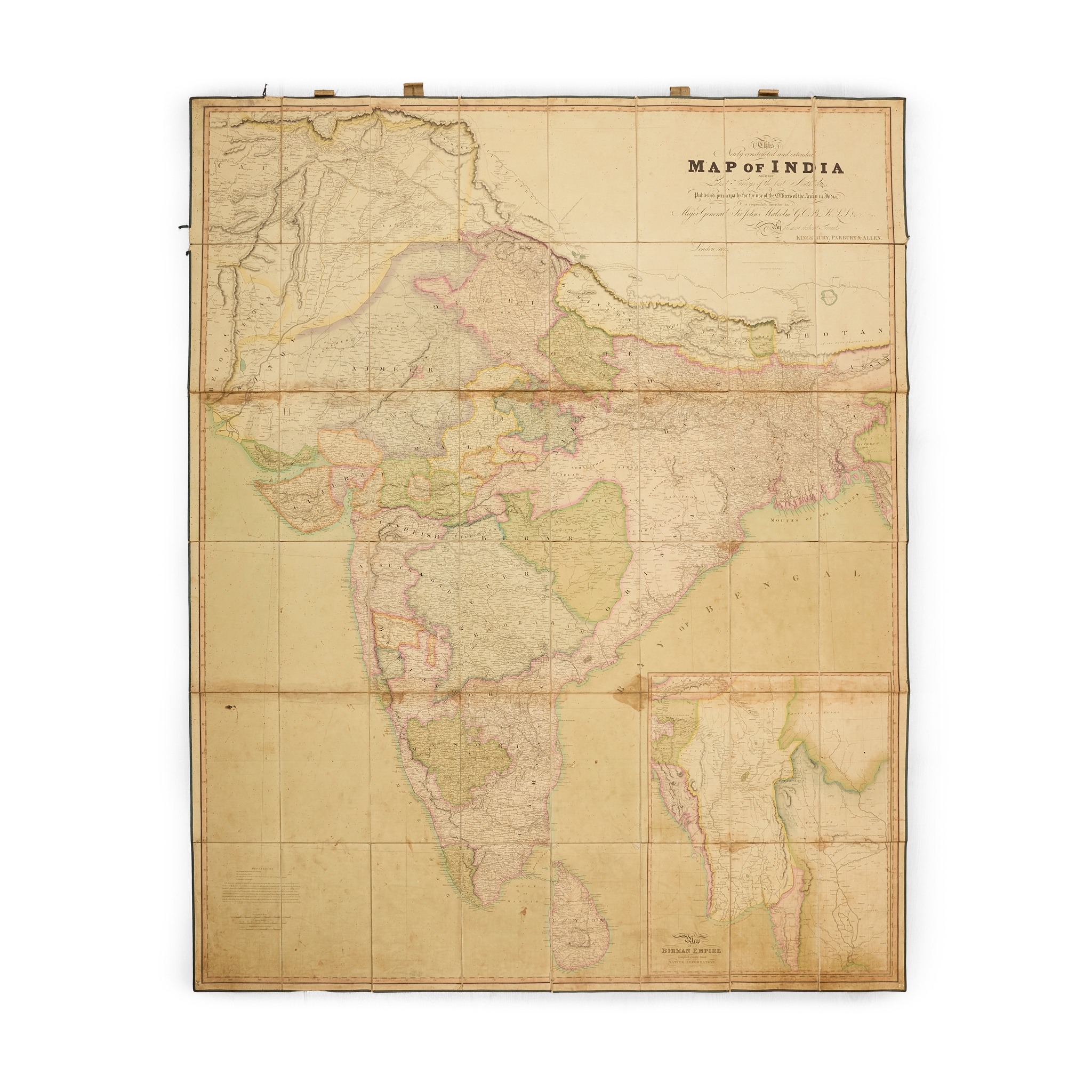 from the Latest Surveys of the Best Authorities, published principally for the use of the Officers of the Army in India … respectfully inscribed to Major General Sir John Malcolm … published … 1825. Additions to Sept. 1827. London: Kingsbury, Parbury & Allen, 1827. Wall-sized engraved map with original hand-colouring, 157 x 126cm, sectionalised into 48 panels and laid on linen, with ‘Map of the Birman Empire compiled chiefly from Native Information’ inset, green silk piping along edges, four linen pull-tabs stitched to verso along top edge, toning, a few damp-stains and stipples of small dark spots, housed in contemporary card slipcase (worn, remains of green skiver covering)