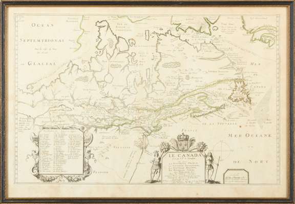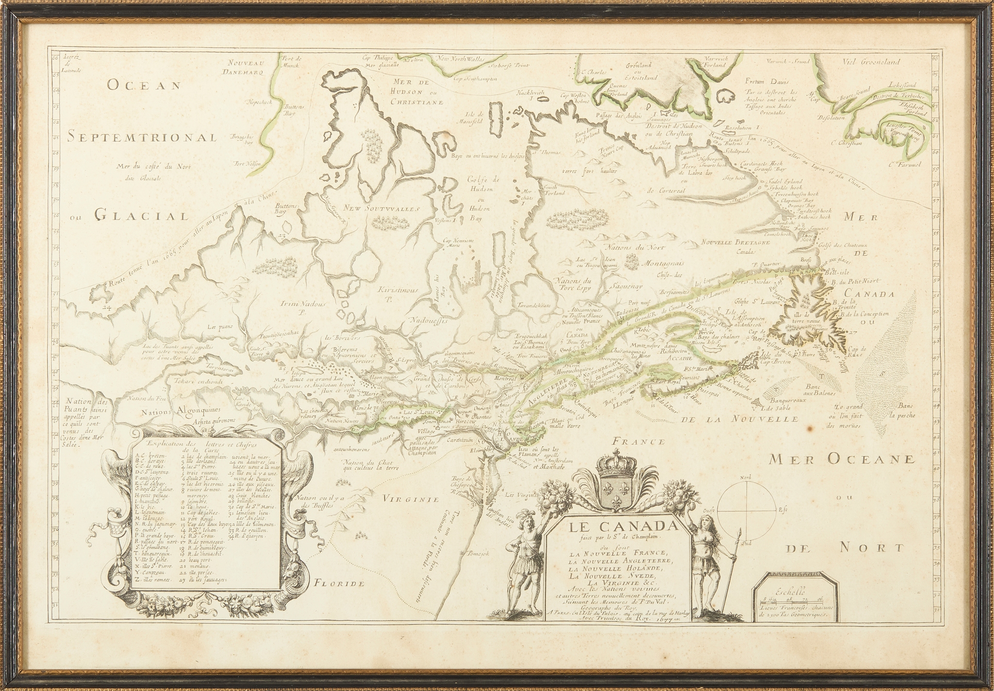 faict par le Sr. de Champlain où sont la Nouvelle France, la Nouvelle Angleterre, la Nouvelle Holande, la Nouvelle Suede, la Virginie etc. Avec les nations voisines et autres terres nouvellement decouvertes. Suivant les memoires de P. Du Val, geographe du Roy. Paris, 1677. Hand-coloured engraved map (39.5 x 57.5cm), depicting French territories in eastern Canada and the American Atlantic Seaboard, showing in detail areas corresponding to modern-day Quebec, New Brunswick, Newfoundland and Labrador, Hudson's Bay, New England, and part of Greenland, framed and glazed, some browning and spotting