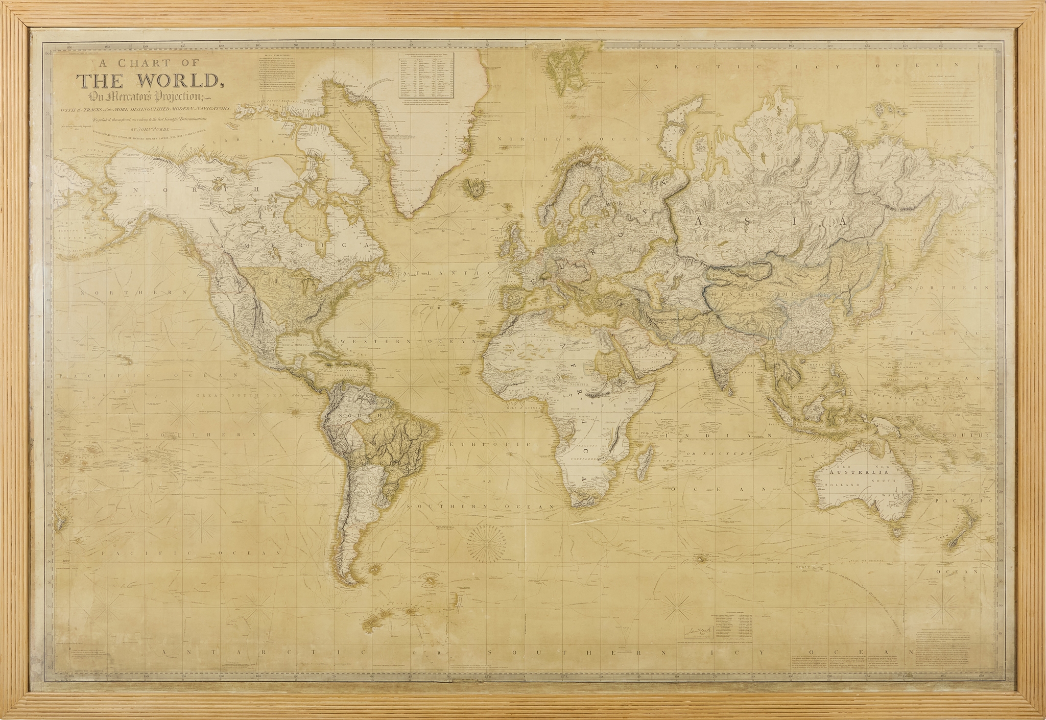 With the Tracks of the More Distinguished Modern Navigators. Regulated throughout, according to the Best Scientific Determinations. Published August 14th 1828 … New Edition, Materially Improved, 1830. London: Richard Holmes Laurie, 1830. Engraved wall-sized world map, 128.5 x 192cm, contemporary hand-colouring, mounted, framed and glazed, toning, tears and paper disruption along edges, a few similar blemishes within image