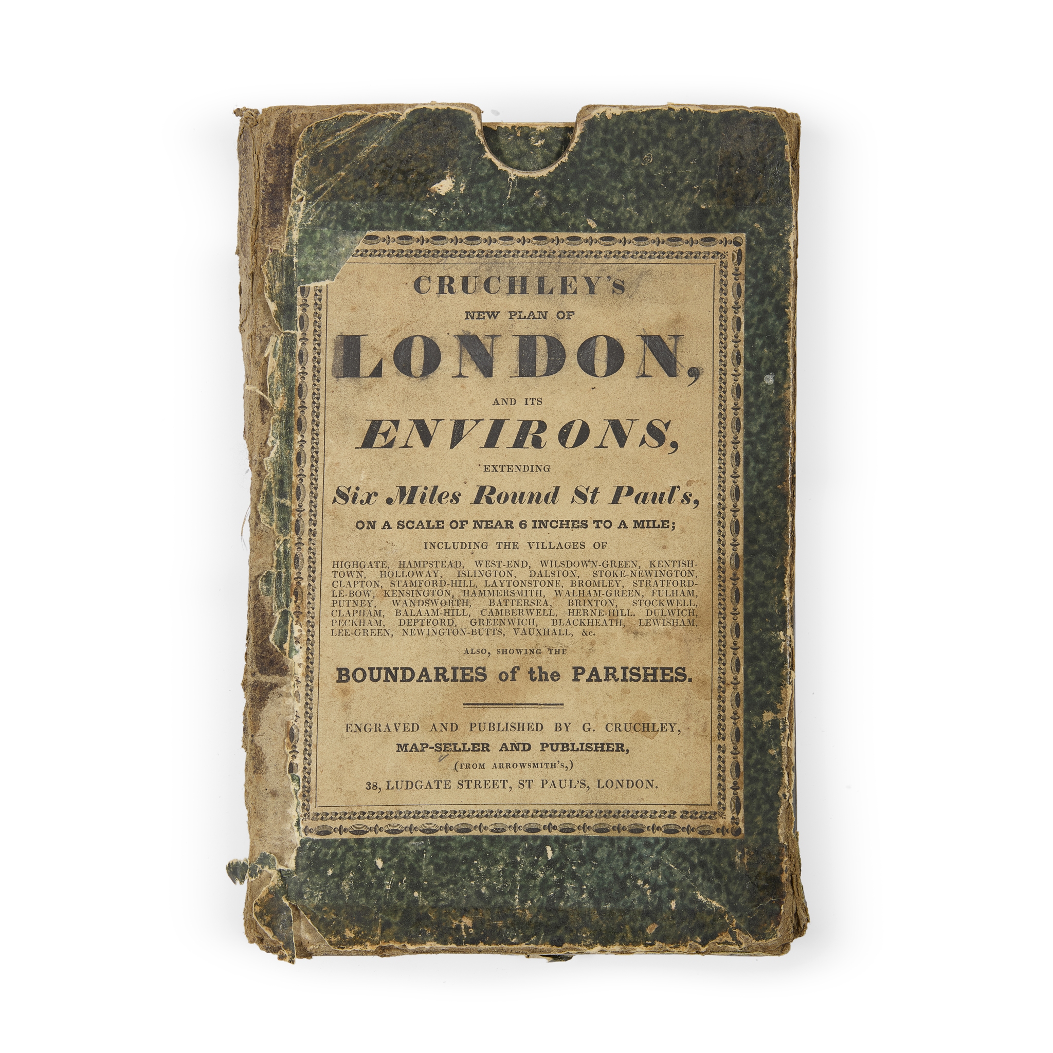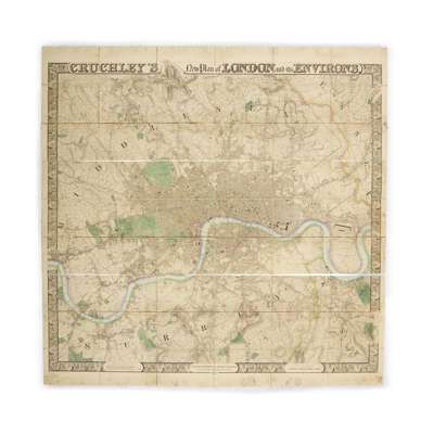 London: engraved and published by Cruchley map-seller (from Arrowsmith's), 1831. Large engraved hand-coloured map, sectionalised and laid onto 3 separate linen sheets, approx. total dimensions 134 x 139cm, decorative neoclassical border, housed in original green card slipcase with printed paper label, map toned, damp-staining to margins, a few small damp-stains and blemishes within the map, a few panels lifting at corners, slipcase worn and split
