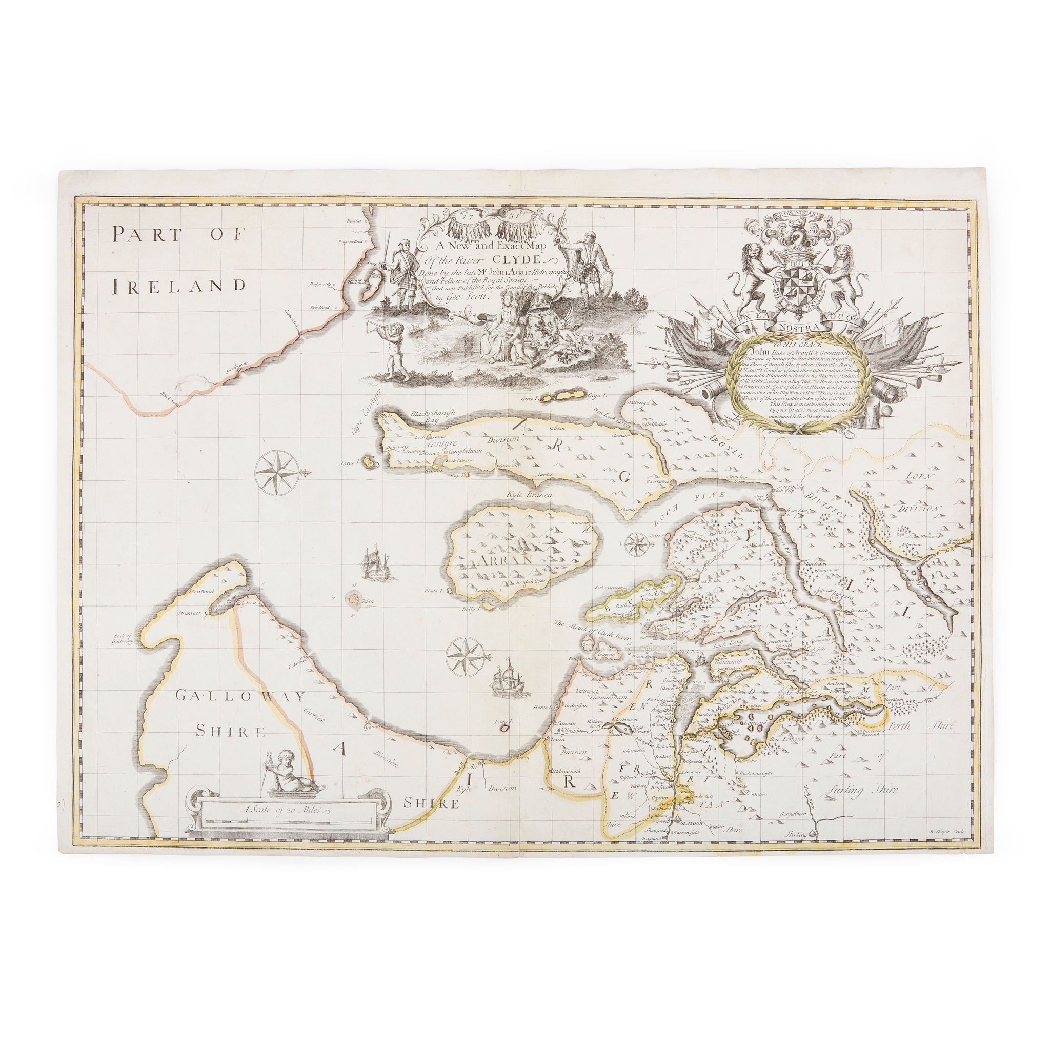 [No place:] Geo. Scott, 1731. Engraved map by Richard Cooper after John Adair, oriented to the west, on two conjoined sheets, 51 x 70cm, hand-coloured in outline, decorative title cartouche and dedication to John Campbell, 2nd Duke of Argyll (commander of Hanoverian forces during the 1715 Jacobite Rebellion), compass roses, two small vignettes of ships at sea, neat repairs to verso [RSGC, The Early Maps of Scotland to 1850, 3rd edition, 1983, volume 2, p. 14]