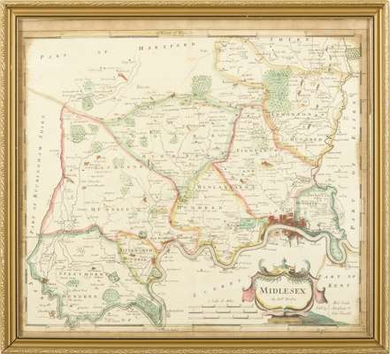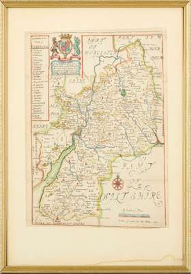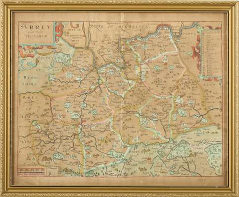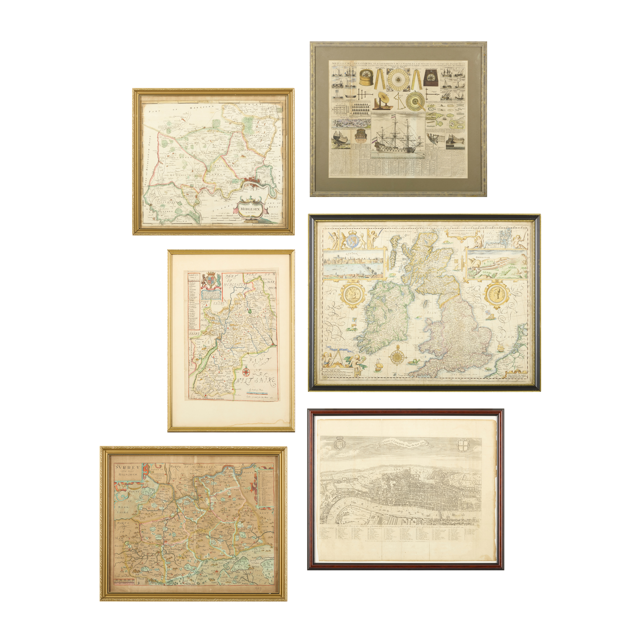 and 4 other engraved maps and prints, all hand-coloured, framed and glazed (18th-century French maritime print titled ‘Nouvelle carte pour conduire à la connoissance de la marine', 50.5 x 61cm; William Kip after John Norden, Surrey olim sedes regnorum, [1637], 32 x 39cm, browned; Richard Blome, [Gloucestershire], 1671, 25 x 20.5cm; Robert Morden, Middlesex, [1695], 38 x 42cm, margins browned (6)