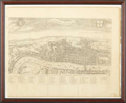 [Maitland, William]. A View of London about the Year 1560. Reduced to this Size from a Large Print in the Collection of Sr Hans Sloane, Bart. [London], 1738]. Engraved view, 40.5 x 51cm, mounted, framed and glazed, wide margins, toned, old folds, a few nicks to extremities;