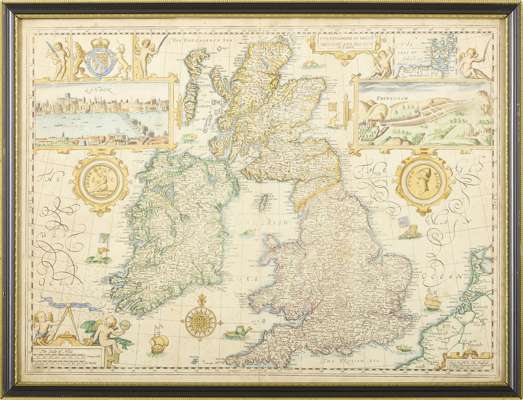 London: to be sold by Tho. Bassett and Ric. Chiswell, [1676]. Hand-coloured engraved map, 39.2 x 52.5cm, inset views of London and Edinburgh and map of the Orkney Islands, English text on verso, glazed both sides and framed, light browning, apparent repaired closed ear to lower left corner between mileage cartouche and Irish landmass, wear to text 'The Irish Sea' around central fold, old repairs to central fold, small closed tear to lower margin, crack to glass on reverse;
