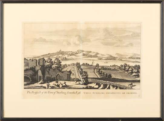 [Slezer, John]. The Prospect of the Town of Sterling from the East. [London, 1693]. Engraved print of Stirling, one of the plates from Slezer's 'Theatrum Scotiae,' framed and glazed (43.5 x 58.8cm, mount aperture 28.5 x 43.5);