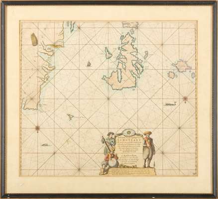 Keulen, Johannes van. Pascaert vande Westkust van Schotlant, als mede een gedeelte van de Lewys Eylanden. Amsterdam: van Keulen, [1712]. Hand-coloured engraved map (65 x 71cm, mount aperture 50.5 x 57.5cm), framed and glazed, of North West Coast of Scotland, showing Lewis, St. Kilda, North Rona, minor staining and browning;