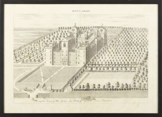 [Slezer, John]. Bogen-gicht: being the seat of His Grace the Duke of Gordon near Aberdeen. [London, 1719?]. Engraved print of Heriot's Hospital, Edinburgh, wrongly named as Bogengicht [Bog of Gicht], the seat of the Duke of Gordon, one of the plates used in two later editions of Theatrum Scotiae (1719 and 1728/29), framed and glazed (45 x 62cm) (8)