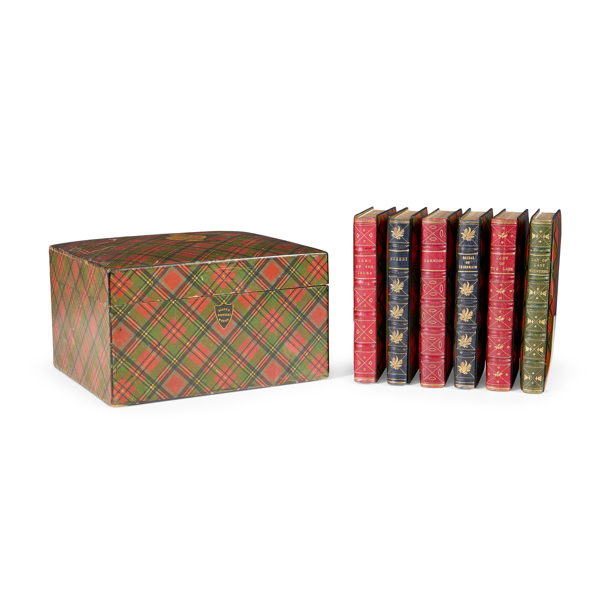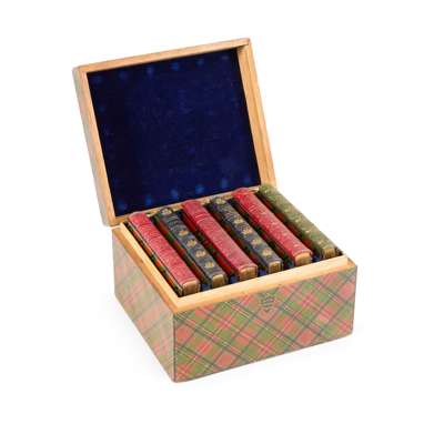Edinburgh: Adam and Charles Black, 1867-70. 6 volumes, 16mo (13.5 x 8.2cm), comprising ‘Lord of the Isles' (1867), ‘Rokeby’ (1869), ‘Marmion,’ ‘Bridal of Triermain,’ ‘Lady of the Lake,’ ‘Lay of the Last Minstrel’ (all 1870), contemporary Mauchline-ware bindings of wooden covers transfer-printed with tartan patterns, gilt blue, red, and green morocco spines, all edges gilt, engraved additional vignette title-page to each volume, in wooden Mauchline-ware box (11.5 x 19 x 16.5cm), covered with Stuart tartan pattern waxed paper, with vignette of the Sir Francis Chantrey 1820 bust of Scott on lid, blue velvet lining, slight spotting to engraved title-pages but otherwise internally very clean, box with some scratches and discolouration, base of box worn with loss of covering in places