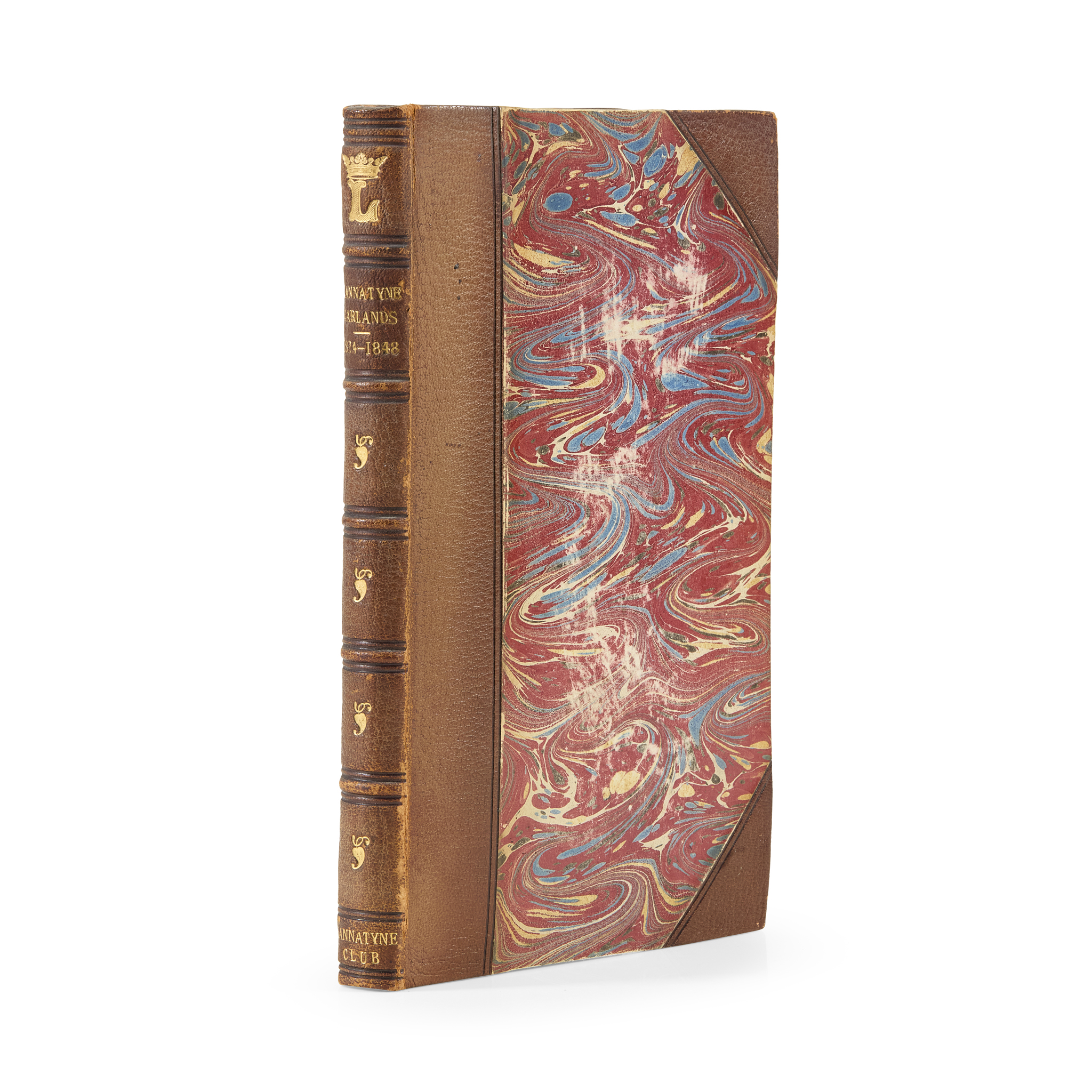 Edinburgh: [Bannatyne Club, [1823-48]. 11 works in 1 volume, 8vo (19.7 x 12cm), comprising [i] The Poems of George Bannatyne [edited with an extensive commentary by David Laing], 1824 [Note: Terry 4a]; [ii] A Bannatyne garland, quhairin the president speaketh [by Sir Walter Scott], [1823] [Note: Terry 118.1]; [iii] The Bannatyne garland, number second [by Patrick Fraser Tytler], [1823] [Note: Terry 118.2]; [iv] Ane richt pithie and pleasant ballat of Bannatyne, 1824 [Note: Terry 118.3]; [v] A Bannatyne garland [by Patrick Fraser Tytler], 1824 [Note: Terry 118/4]; [vi] Ane Bannatyne Garlande, brevit be Maister Patrick, of the Kingis Chekar [by Patrick Fraser Tytler], [1826 Note: Terry 118.5]; [vii] A new Bannatyne garland; compylit be Doctor Jehan of the Hall Ryal, [by Dr. John Jamieson], 1829; [viii] Ane new Bannatyne garland [by Patrick Fraser Tytler], 1829 [Note: Terry 118.7]; [ix] Ane plesand garland, being ane lytill and merrie conceited geste callit Ye coirne-clyppis ... [by Robert Pitcairn], [1830?] Note: [Terry 118.8]; [x] Two Bannatyne garlands from Abbotsford [by Sir Walter Scott], 1848 [Note: Terry 118.9] Presented by David Laing; [xi] Tears on the death of Evander Occasioned by the lamentable losse of the truelie noble Sir Iohn Svynton knight ... by G. Lauder, [1848], contemporary brown half morocco, the Marquesses of Lothian copy with the crested L[othian] at head of spine