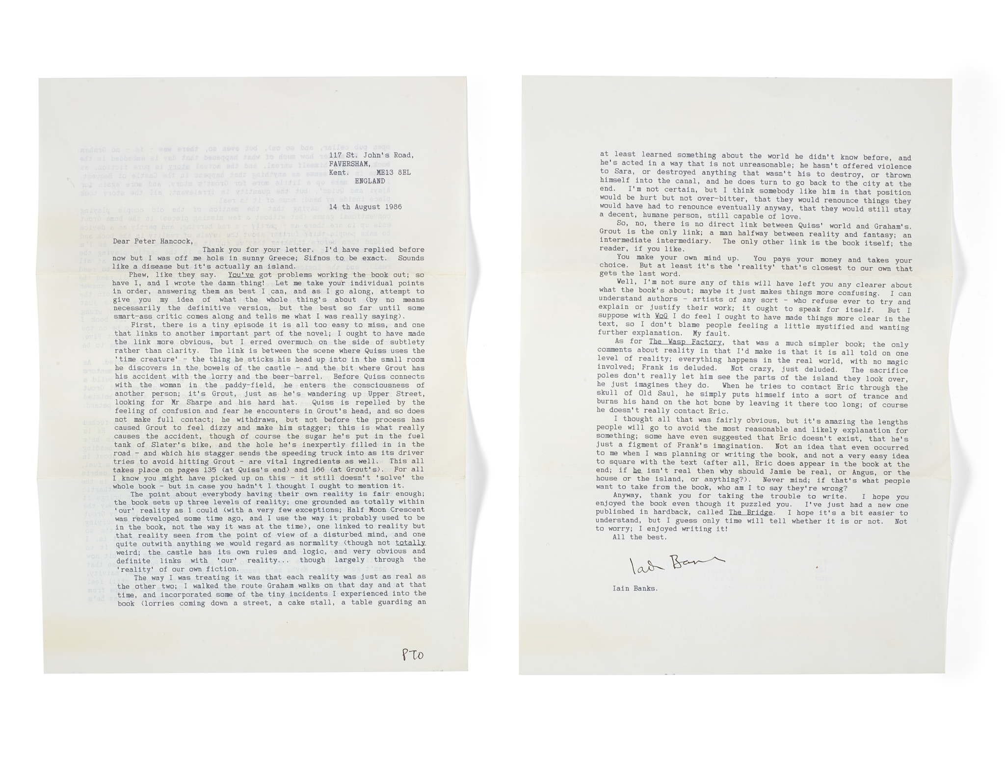 addressed to a Mr Peter Hancock, expounding the ideas, structure, characters and meaning of Banks's second published novel Walking on Glass ('You've got problems working the book out; so have I, and I wrote the damn thing!'), referring also to The Wasp Factory ('that was a much simpler book … it is all told on one level of reality; everything happens in the real world, with no magic involved'), and his recently published novel The Bridge ('I hope it's a bit easier to understand'), word-processed, 2 leaves of A4 paper with text on 3 sides, signed by Banks at foot of second leaf in black ink, retaining part of original envelope