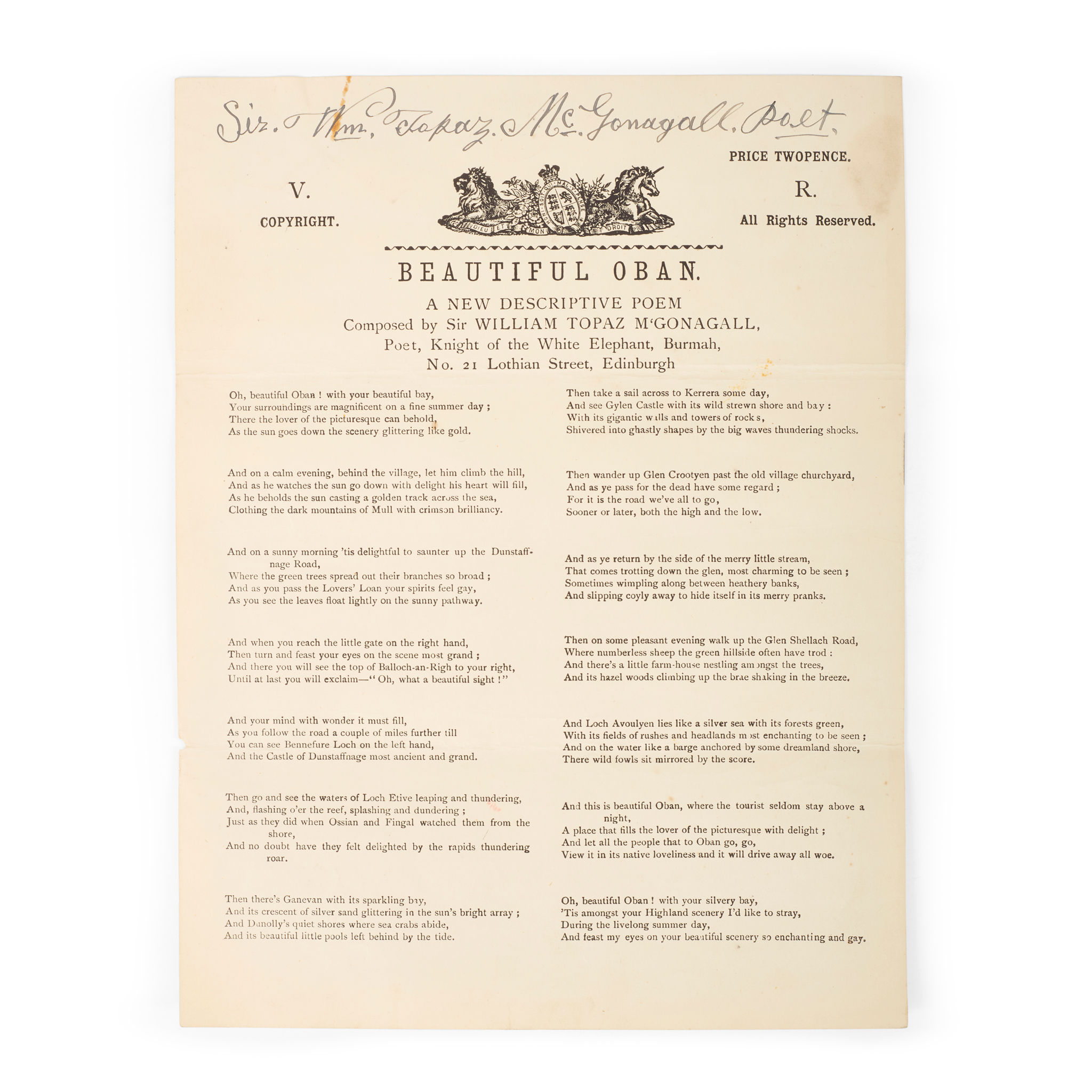 A New Descriptive Poem. [Edinburgh: for the author], c.1900. Printed broadside (25.8 x 19.2cm), signed by the author ('Sir Wm Topaz McGonagall, Poet') in black ink, text in two columns, title and royal coat arms to head, a few marks including old rust-stain to top margin, old folds