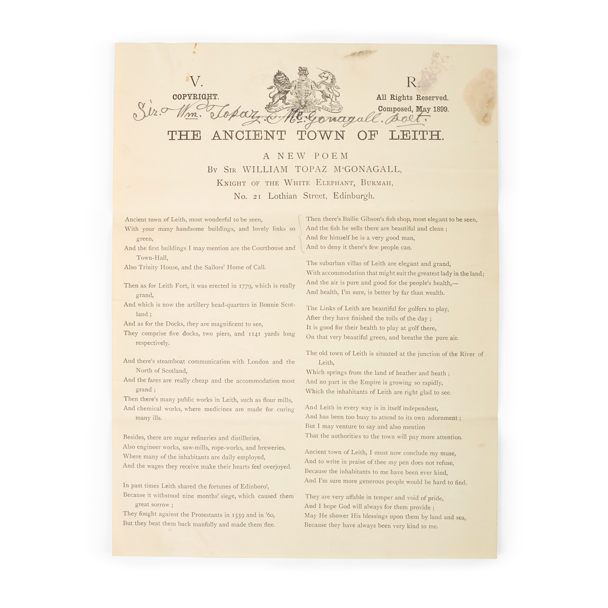 A New Poem. [Edinburgh: for the author], May 1899. Printed broadside (24.8 x 18.5cm), signed by the author (‘Sir Wm. Topaz McGonagall, Poet’) in black ink, text printed in two columns, title and royal coat arms to head, a few marks, old folds, a couple of small nicks to left-hand edge