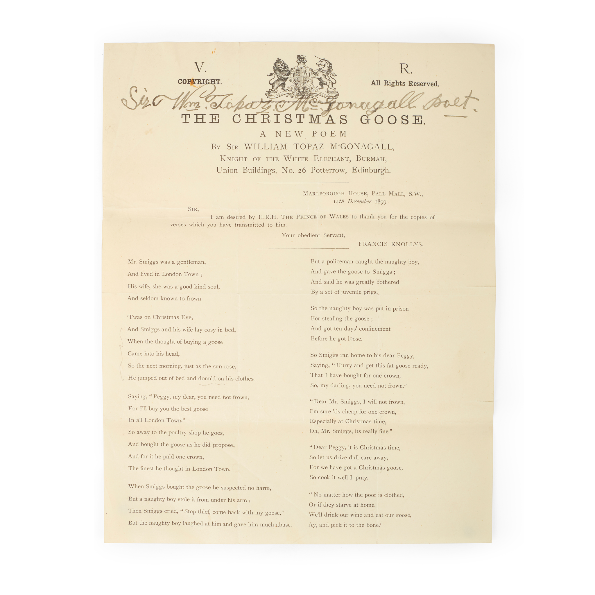 A New Poem. [Edinburgh: for the author], c.1900. Printed broadside (25.2 x 19.8cm), signed by the author ('Sir Wm Topaz McGonagall Poet') in black ink, text in two columns, title and royal coat of arms at head, a few marks, old folds