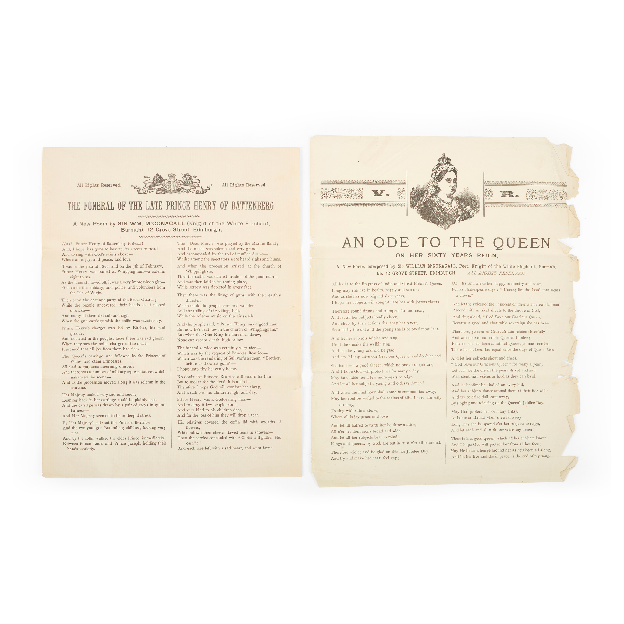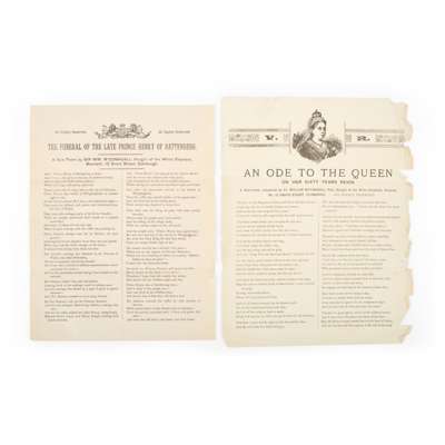 The Funeral of the Late Prince Henry of Battenberg. A New Poem. [And:] An Ode to the Queen on her Sixty Years Reign. A New Poem. [Edinburgh: for the author], c.1896-7. Two printed broadsides (25.5 x 20cm and 27.2 x 21.5cm), each with the text in two columns and title at head, The Funeral additionally with royal coat of arms and An Ode with portrait of Queen Victoria, An Ode chipped along right-hand edge (2)